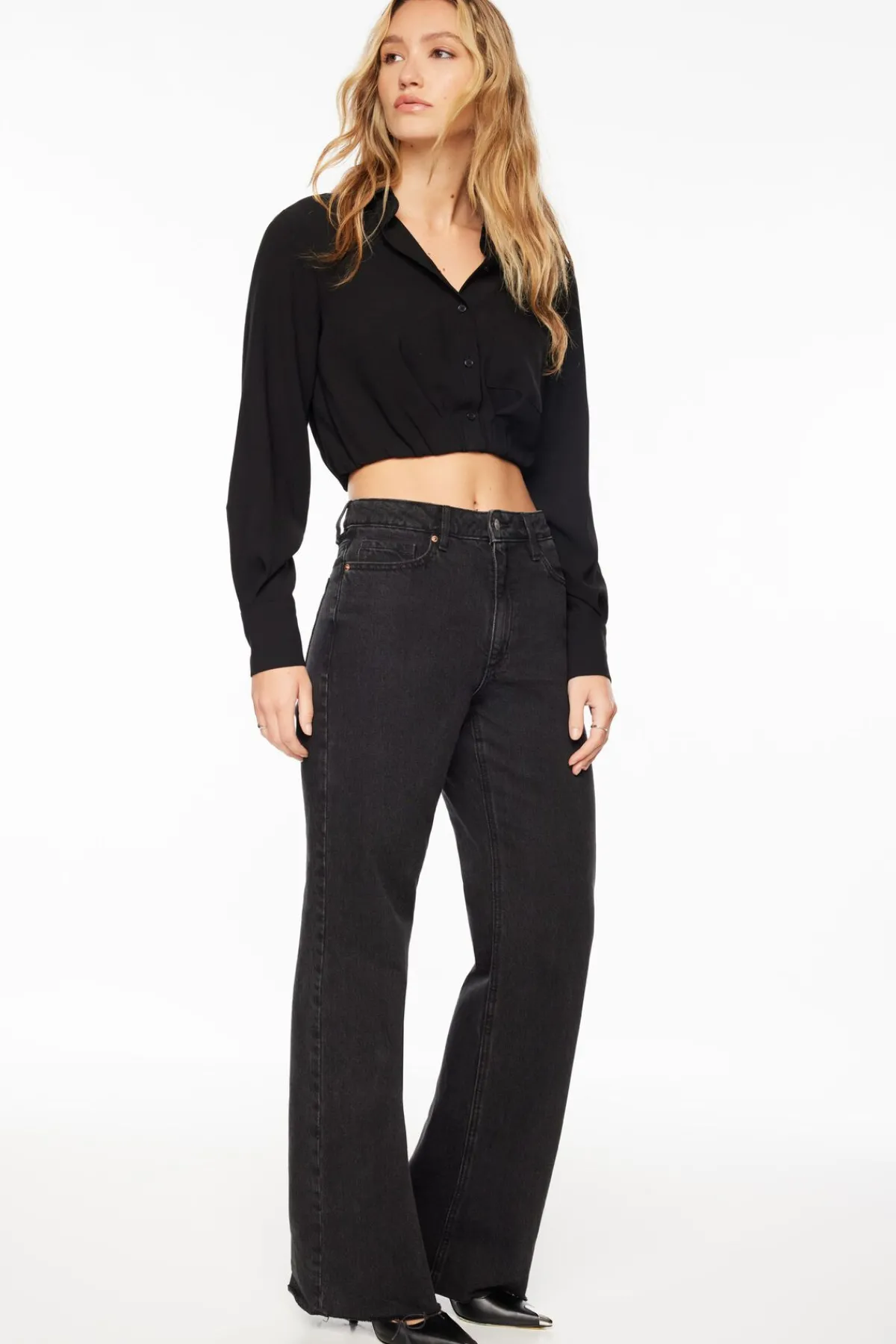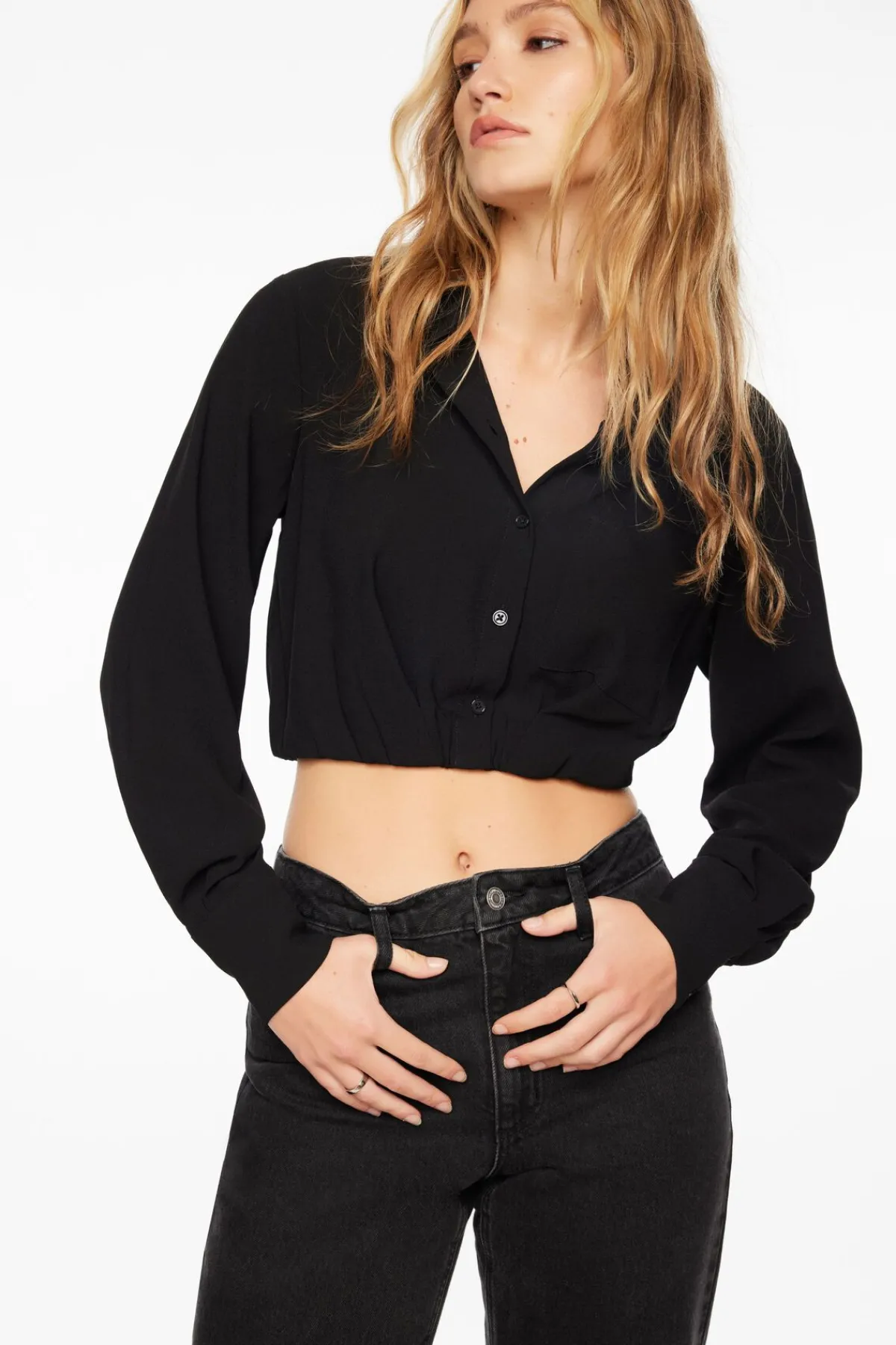 This is a cropped long sleeve button up shirt – Designed with an elasticated waist to create a cinched silhouette.