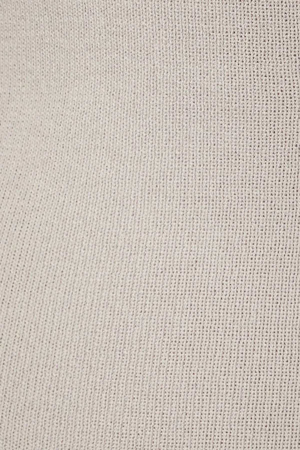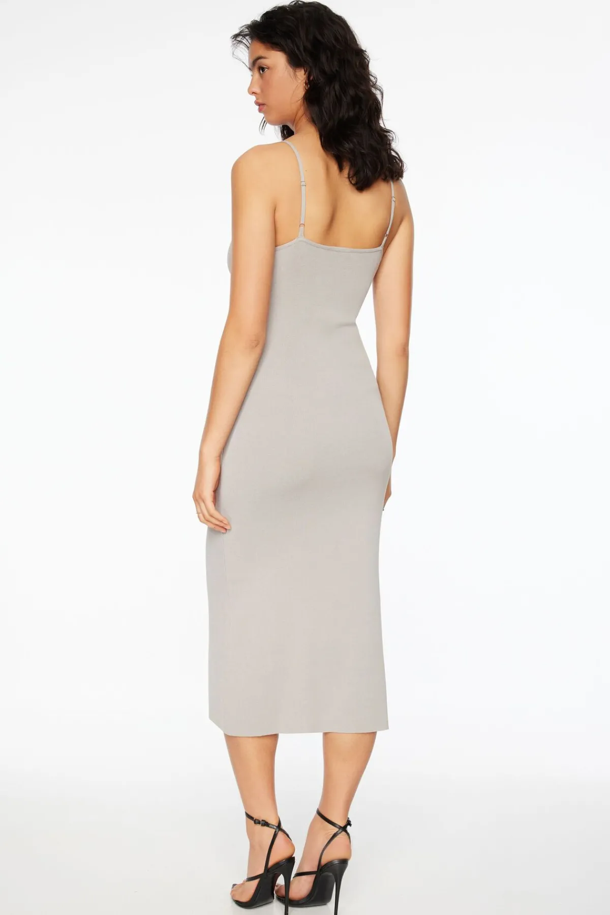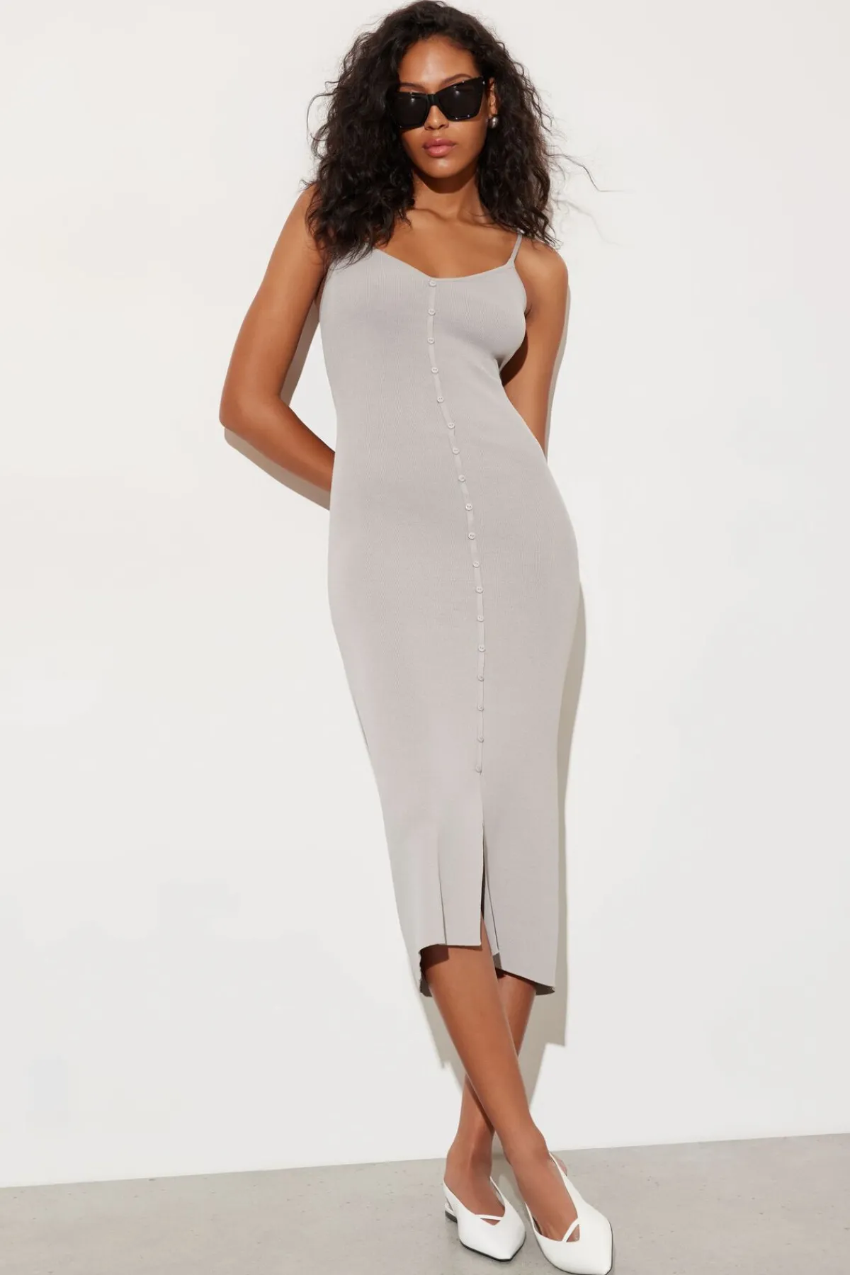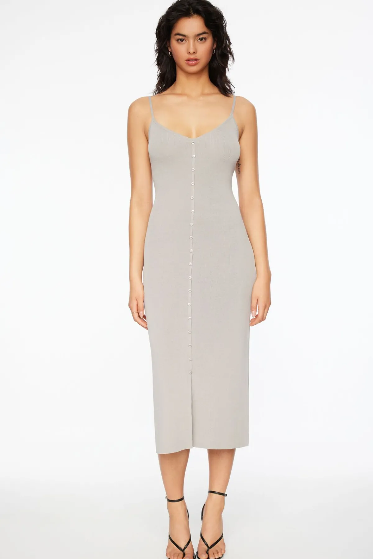 This is a V-neckline button down sweater dress with a front slit. Made with figure skimming yarn fabric that sculpts your form.