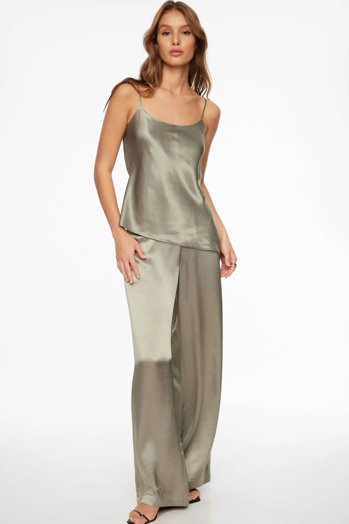 Slip into this satin cami. Designed with a relaxed fit and an asymmetric hem.