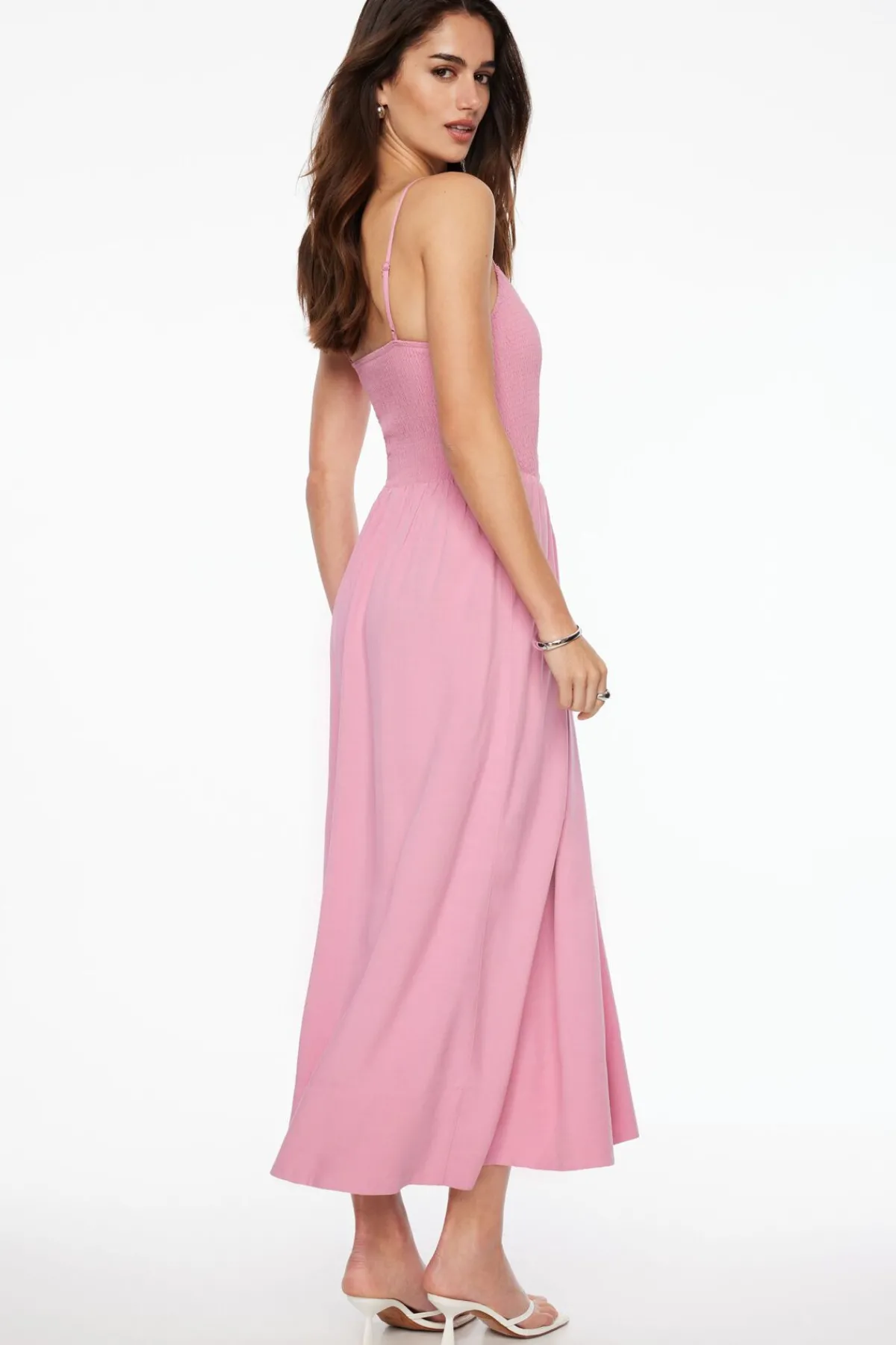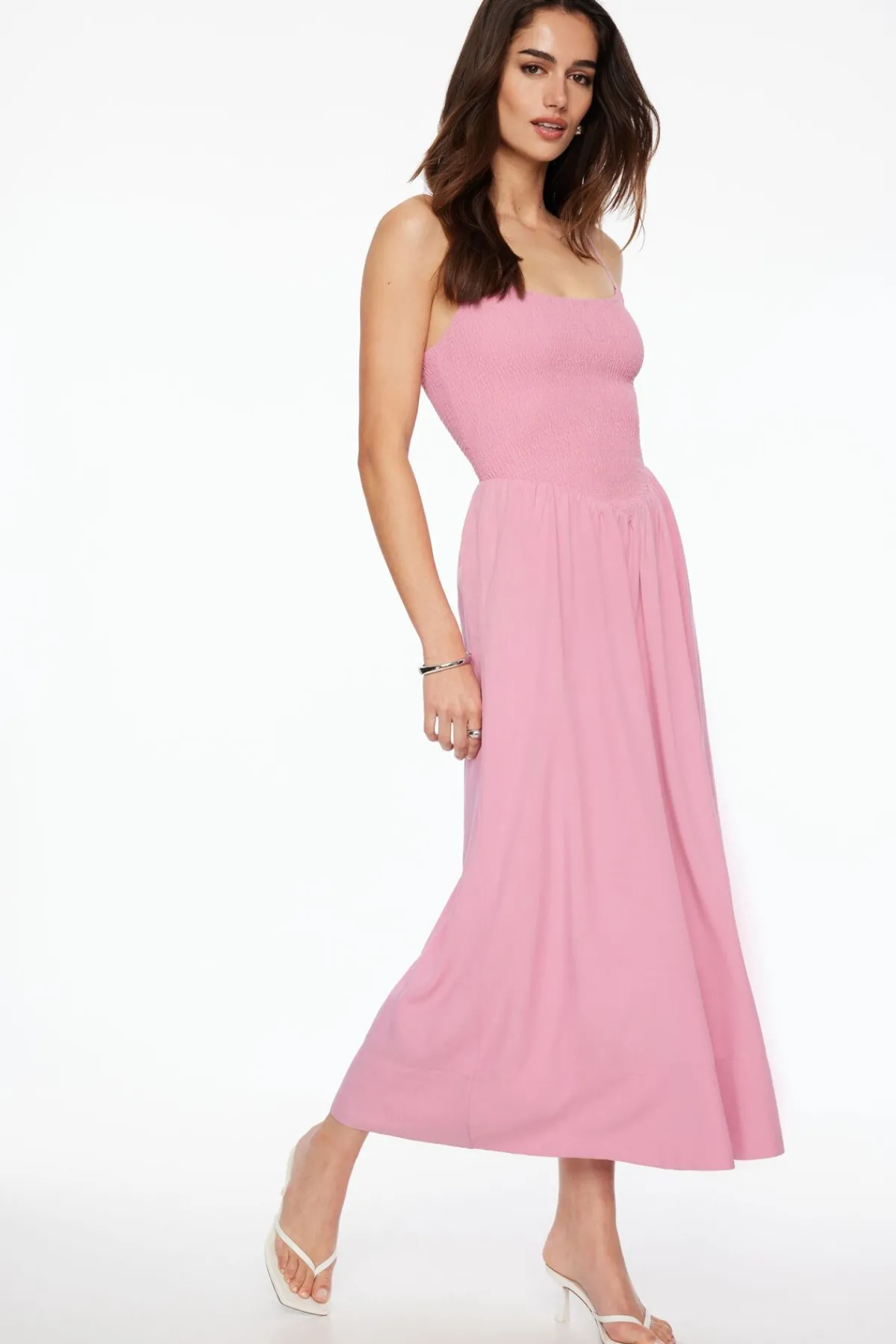 This is a smocked linen maxi dress – Designed to be fitted and gathered at the waist with a stretch for easy dressing.
