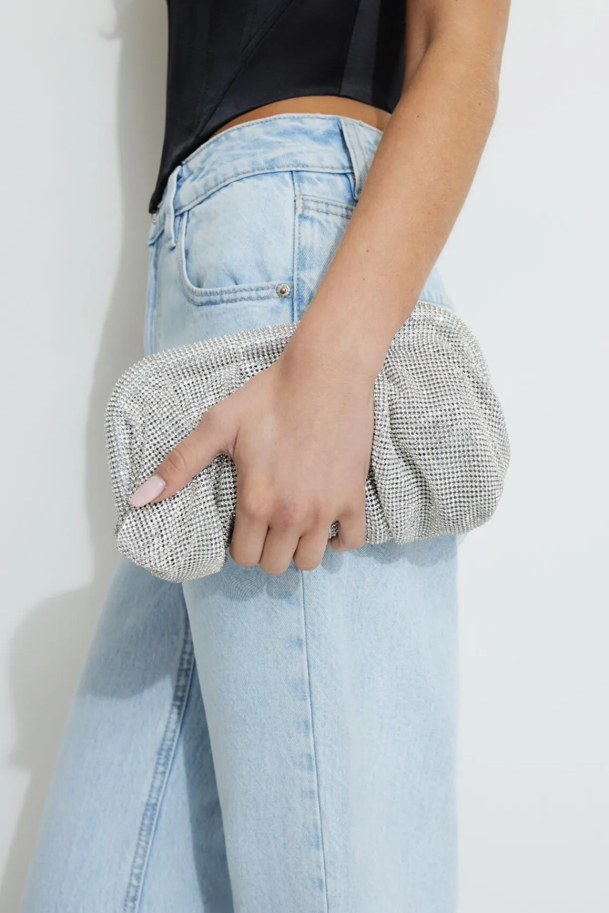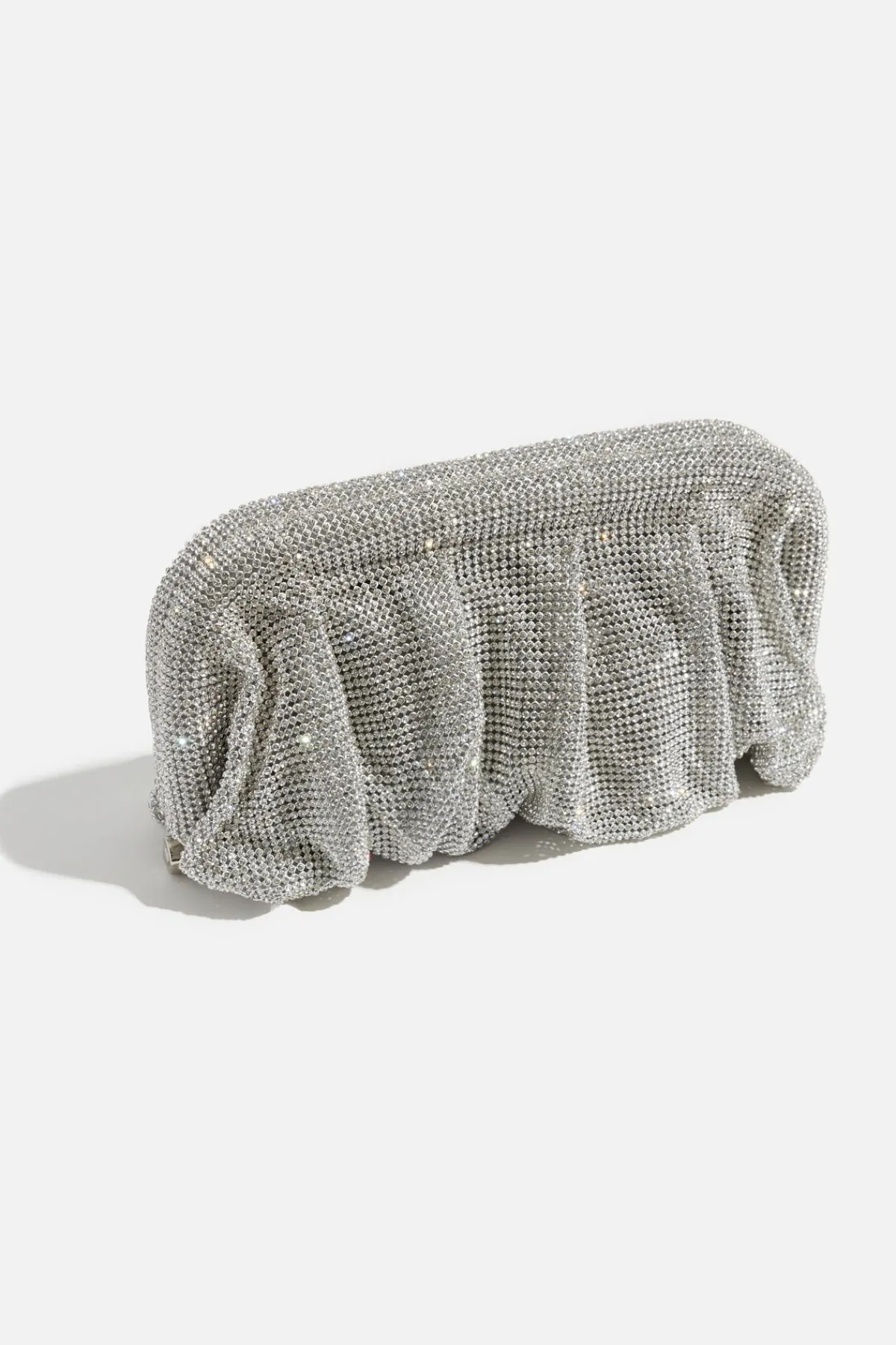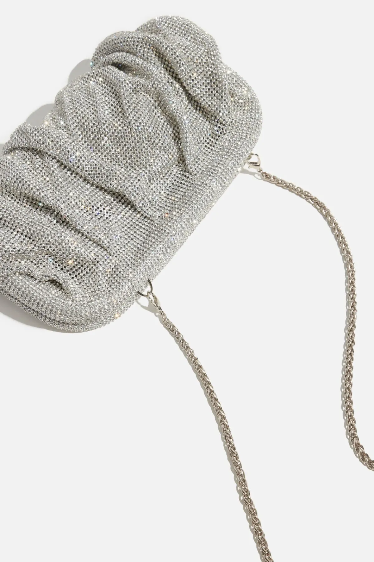 Draped Gem Clutch Grey – Shine bright. Features Gemstone detailing Detachable chain link shoulder strap Hinged closure S…