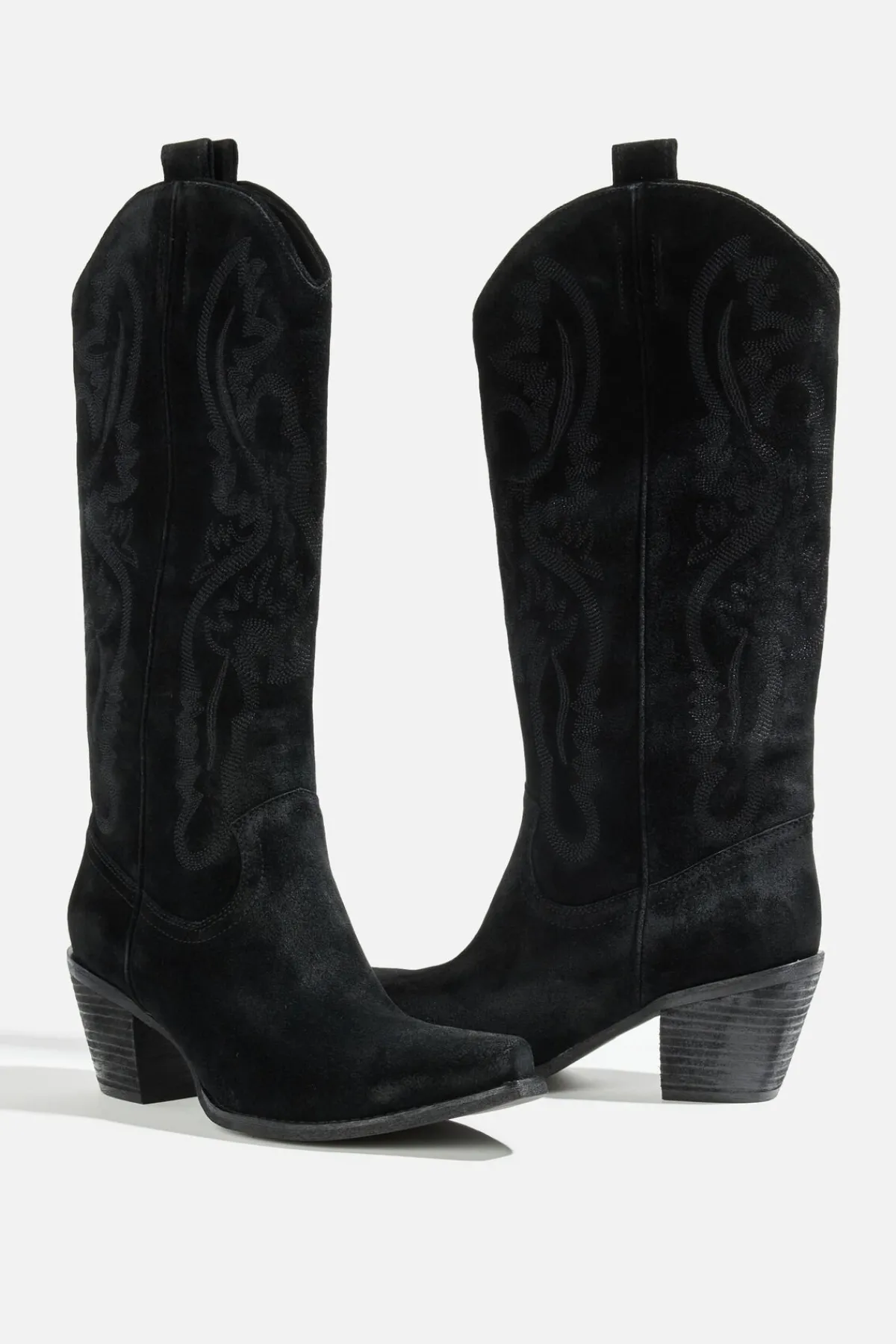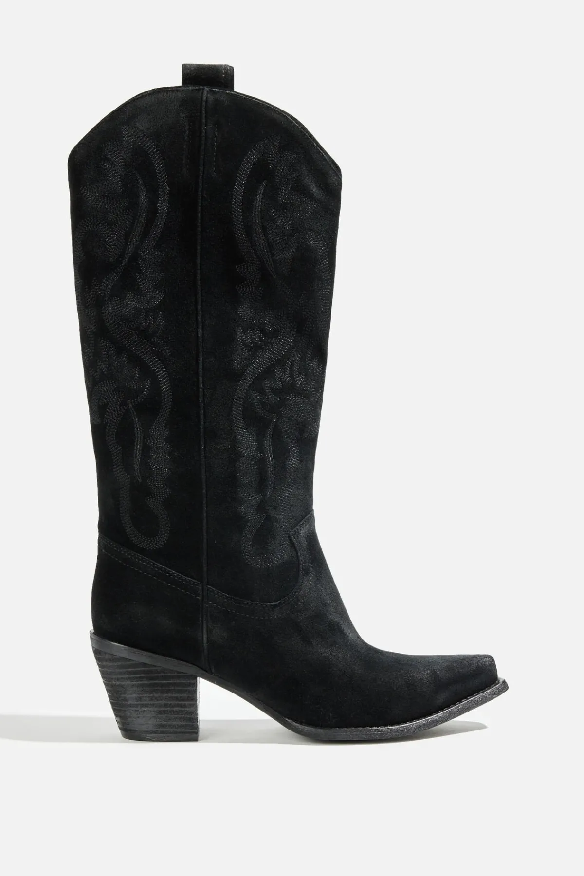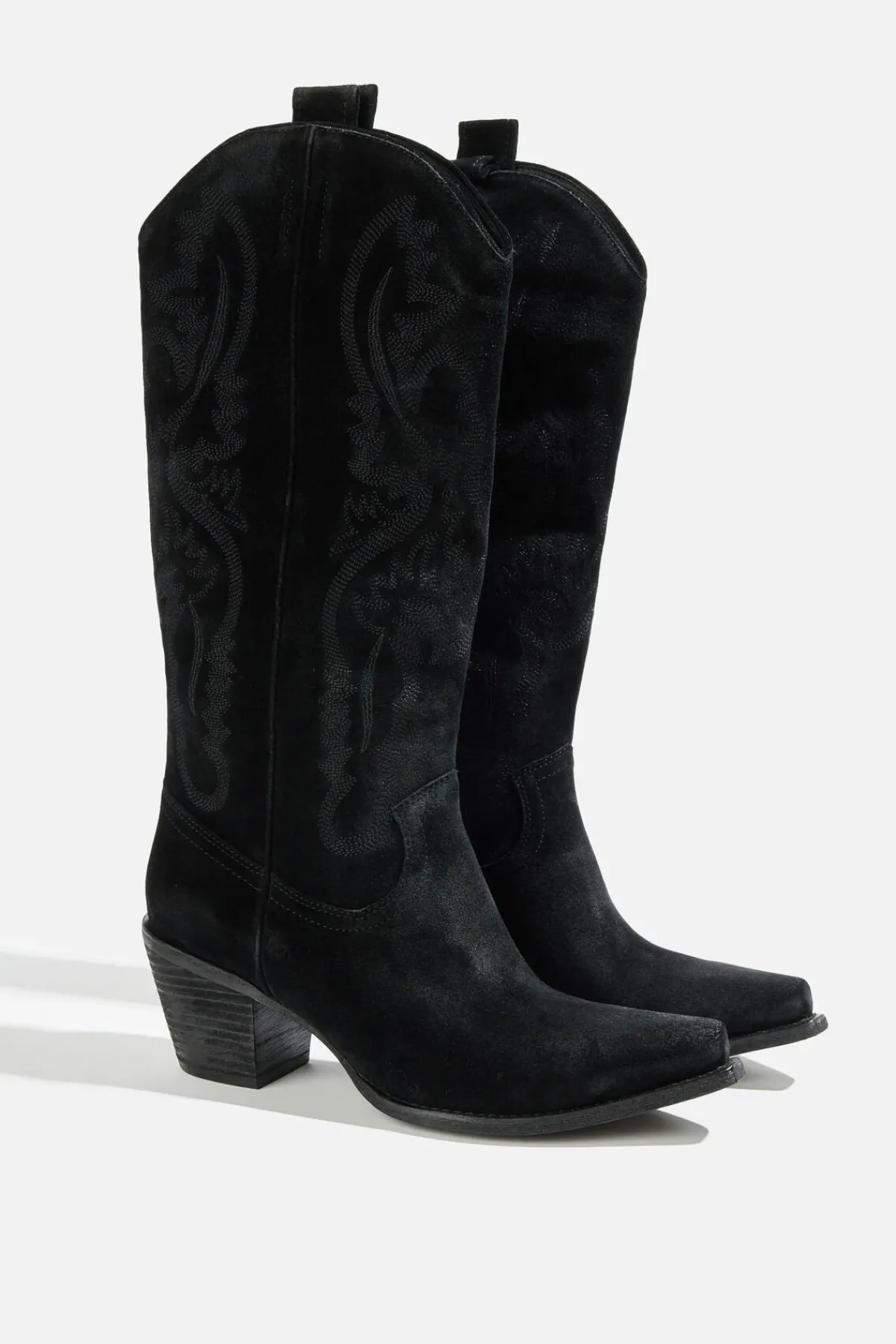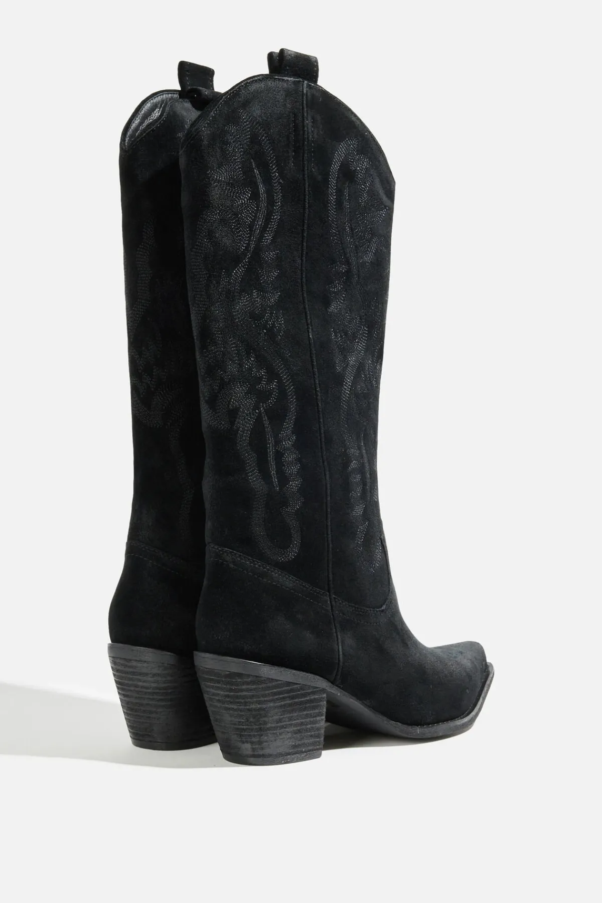 JEFFREY CAMPBELL | Rancher Cowboy Boots Black – Buckle up with these knee-high suede boots. Features Pointed toe Embroid…